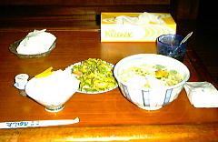 「でーじやっさー」写真は、王が義父宅でいただいたある日の晩飯。 山盛りのごはんにゴーヤーチャンプルー、沖縄そば、アイスコーヒー、そして 鹿児島のお菓子まで! もうおなかいっぱい。 |