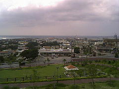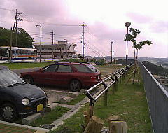 絶景100景--第2景 第1景はゴミの話や歩道寸断の不思議につい目を奪われてしまったが、 今回は本来の趣旨に基づいて景色のいい場所を紹介したい。 那覇から国道58号線を北上する場合、謝苅交差点(歩道橋がある)を右折する。 くねくね道を上ること約2キロで、「謝苅公園」に着く。斜面を切り開き、 2001年5月に完成した公園である。斜面の上には12台分の駐車場がある。 下のENEOSの隣に6台分の駐車場がある。 子供が遊ぶ遊戯具が少しだがある。