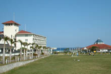 ビッグタイムリゾート伊計島とグラウンド。 左の本館の裏にコテージがある