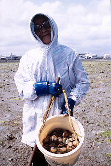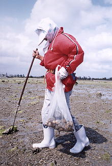干潟歩きのオバちゃんスタイル。日焼けもウニもこわくない