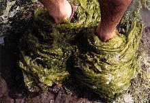 今泉真也と行くワッター自然 第3回 海を歩いてきました 泡瀬干潟(→地図)に行ってきました。混雑する日曜を外した4月の大潮の日、ちょうど干潮がご飯ドキなので、お弁当に手作りサンドイッチを用意してリュックに入れ、まずまずの天気の中、海へと向かいます。ずっと暗い森の小さな世界に焦点を合わせていた目が、光のあふれた、広い、風の渡る世界に戸惑っているのがわかります。でも潮風の抜ける海辺の気持ちのいいこと! 持ってきた干潟ファッションにさっそく身を包んで、出発です。相棒は日焼けを考えて長袖長ズボンですが、僕は久しぶりの散策にウキウキしてTシャツ海パンにしてしまいました。今や10時から14時あたりの紫外線は非常に高確率でガンを引き起こす強さになっているとのこと。自殺行為ではありますが、それでもいいやア! と思ってしまうほど、気分のいい昼下がりでした。 今回は干(ひ)いている時間もそう長くはないのに、はるか沖合に人影がちらほら見えます。沖とはいってもそこは陸地になっているのです。普段は歩けないところをどんどん行ける感覚が、なんともワクワクします。足下には緑の海苔の仲間アーサがびっしりと覆い尽くしていて、口にしてみてもひと月前のような繊細な歯触りはもうありませんが、歩くたびにブワッブワッと沈み込むのが何だか雲の上を歩いているようで、またまた楽しいのです。 向こうからオバさん3人組が日焼け防止の完全装備で帰ってきました。もうすでにブクブクと泡を立てながら満ちてきている潮に追われながら歩いてきます。この泡が干潟の生きている証とでもいうもので、砂の中に生きものが住んで耕しているために、中に含まれた空気がまた海中に溶け込み、酸素の豊富な浅海を造りだしているわけです。オバさんたちは片手にバケツ、片手にヤス(モリ)という正統派スタイルで、怪しいと思われる所々を突きながら探しています。下に貝が潜っていれば、たまらずにピュッと水を噴き出すのでわかるのです。貝もじっとしていれば捕まらずにすむのに、ついびっくりして殻に閉じ込もってしまうのです。鳥と同じような手を使うんだなあ、と思いました。鳥はクチバシと足を使って同じように魚やカニ、貝を捕まえます。 こうして沢山のヒトや鳥がいくら潮干狩りを楽しもうと、干潟は水が健康であればまた無数の生命を生み出し、恵んでくれます。干潟という環境は海の中でも希少な、特殊な条件のもとにできたものですが、それよりもまず僕たちが歩いて楽しく、感動し、学べ、糧もいただいてきた場所だということ。それがなによりも価値があると思うのです。この干潟の埋め立て計画に反対する署名10060名分が5月2日、県に提出されました。作るものはリゾート施設などですが、皆さん、ホテルの人工ビーチを離れ、ぜひ一度自然の干潟を歩いてみてください。きっと干潟ファッションのトリコになること請け合いです! 今泉メモ ・服装などは写真を参照のこと ・1人1個はバケツを持ってゆくと、弁当を食べる時に腰かけたり、獲物を 入れたりできる。ビニル袋もあるとよい ・釣りは、かなり沖のリーフエッジ辺りまで行けば、時おり大物がくるが、 今回は「散策」なので、別の機会に ・泡瀬干潟はとても広いので、干潮の時によく見える。好きなポイントを 歩こう。散歩にルールはない。ただし、もちろん沖へ歩くと帰りは大変。 海につかることも考えに入れること。潮の満ちる速さはまず自分で一度 体験してみるのがおすすめ。話で聞いても実感できないので・・・。 ・地元の方とのあいさつを忘れずに |