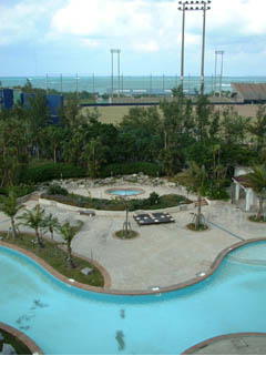 ぐらいうれしかった。さっそくクリスマス直前の12月22日に予約を入れた。 宿泊料金は6000円(1人/ツインルーム)で、 夕・朝食オプションがプラス3800円(1人)だ。 夕食は4つのレストランから選ぶことができ、 朝食バイキングはランチバイキングに変更することができる。 また、ウエルカムドリンクやショッピング割引券など さまざまな特典が付いている。 特典のひとつとしてアーリーチェックイン(午後1時。 通常は午後2時)となっていたので、 お昼から早々とラグナへ向かった。 チェックイン時に、客室グレードアップの抽選があった。 動物マスコットのついた7〜8本の鉛筆から ラグナのシール付き鉛筆を引けば当たりだ。 私は必死で念じながらこっちを向いていたブタの鉛筆を引いた。 見事に外れた。当たればコーナーツインルームだったのに……。相変わらずクジ 運はない。 しかし、開業10周年となる今年の7月には 新館がオープンし、客室数が増える予定で、 その新しい客室に今回のプラン利用者の中から抽選で 10組が招待されるという。 クジ運がないのは分かっているけれど、 「こっちは当たってくれ」と祈らずにはいられない。 客室は4階のツインルームとなった。低い階ではあるが、眺めは良い。ラグナは全 室オーシャンビューとなっている。緑豊かな海浜公園が見渡せ、横浜ベイスターズが キャンプにやってくる野球場が目の前にあり、その向こうが海だ。翌朝ベランダに出 ると、この景色に絵に描いたような虹が端から端までくっきりとかかっていて本当に 美しかった。トロピカルビーチへは公園を散歩しながら 7分ほどで行ける。こう したロケーションも私は気に入っている。