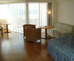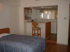 となっている。今回宿泊した部屋は予約の時に「眺めのいい部屋を」と リクエストしておいたので、最上階(10階)のツインルームだった。とても明る いフローリングの部屋で、ダンスでもできそうなほど ゆったりしている。ミニサンルームのようなスペースがあり、 そこのソファに座って景色を眺めれば最高の気分だ。 カウンター式のミニキッチンが付いている。 長期滞在の場合は調理器具や食器、電子レンジなどを ホテルが用意してくれる。