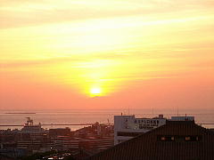 想像できる。「西のアザナ」は無料区域だ。 最寄りの木曳門は、3月から11月は午前8時30分から 午後6時30分まで開いている。 午後6時30分以降は出入りできなくなるので、日没が 午後7時30分近い今の時期は、残念ながら「西のアザナ」からは 夕陽を見ることができない。でも、あきらめる必要はない。 木曳門を出たところ(「西のアザナ」の下)に広がる芝生から、 たっぷり見ることができるのだ。