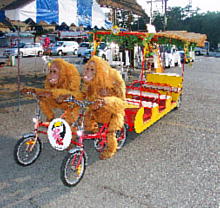 公園の外の広場では、オランウータンの人形2匹が先頭に