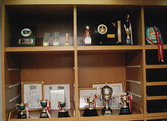 事務所の棚には輝かしい成績を証明するトロフィーがたくさん飾られている |