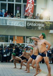 君は「モホMEN」を見たか スクール水着でコミカルな動きをして笑いを呼ぶ 謎の集団が沖縄国際大にいる。沖国大祭では そのショー見たさに人垣ができるほどの大人気だ。 人呼んで「モホMEN」。しかし、「何者なんだ?」 「沖国大生ではないのではないか」などなど、 数々の噂が出回っている。そこで沖縄王では その素性と魅力にぐぐっと迫ってみた。(沖縄王・日高昭子) まずは写真を見てほしい。11月下旬に開かれた 沖国大祭でモホMENが演技を繰り広げている様子である。 この時期、夜ともなれば沖縄でも少し肌寒い。 しかし、モホMENはスクール水着一丁である。 なぜ水着姿なのか? 現在の2代目リーダー・ 我那覇宗敬さんが重々しく明かす。 「裸一貫で愛を伝えるんです」と。 実はこの水着は普天間高指定のものである。 初代リーダー・神里常仁(かみさと・つねひと)さんが 普天間高出身だったことから、これを使っているのだ。 結成は1997年にさかのぼる。 普天間高は体育祭や行事の後に行われる後夜祭がとても盛んな学校だ。その楽し さと面白さを踏まえて、大学ならではの質の高いパフォーマンスを披露したいと 神里さんは思い、仲間を集めて立ち上がる。 モホMENの意味を尋ねたところ、 意外な答えが返ってきた。「モホロビッチ不連続面」(忘れているあなた、やば いです。高校の地学の教科書を見てみましょう)をもじって 「モホロビちっち不連続MEN」と名づけたのである。 周りのお客さんが略して「モホMEN」と呼ぶようになったので、今ではこれが定 着している。 彼らの芸人意識は徹底している。 完成度の高いアクロバットや 数々の笑いの要素を盛り込んだショーをつくるために、 かなりの下準備をしている。ほぼ1年かけていると言っても いいだろう。使う音楽を探し、コミカルな動作を考え、 沖国大祭の3ヶ月前から本格的に練習を始める。 沖国大祭に向けての練習は週に3回〜4回、 11月に入ると週に4回以上になる。 練習場所は極秘であるとして、教えてもらえなかった。 でも、午後11時ごろから明け方までの時間帯に 練習するそうだ。 練習場所は秘密だ。 完成されたものを見せて喜んでもらうのがプロであり、 その過程は見せるべきではないということだ。 彼らは「常に新しいもの」を心がけている。 パフォーマンスには常に新しさを取り入れるので、 情報には敏感だ。ラジオや音楽番組をチェックし、 ショーに使える曲をストックしている。 選曲のポイントは「聞いたらすぐにイメージが浮かぶもの」だ。 クスッと笑えるレトロな曲を集めるセンスは抜群だ。 人の動作を観察して面白い動きがあれば これもチェックする。こうして、選んだ曲をもとに、 観客を楽しませる振り付けを考え出してゆく。 そのために議論を重ねることを惜しまない。 彼らはモホMENであることを日々意識しながら 生活しているのである。 モホMENは言う。「去年よりショーの質が落ちるのなら、 やらないほうがいい」と。5年もモホMENとして パフォーマンスをしてくると、沖国大祭の名物としての 地位を確立しつつある。しかしそのような雰囲気は 本意ではない。我那覇さんが「伝統より伝説」といとも 簡単に喝破した。質が衰えれば、 消え去る覚悟を秘めている。 この潔さを胸に、背水の陣で芸を磨く。 さて、気になるのは、 個性派揃いのメンバーだ。メンバー集めはどの ように実施しているのか。ただ単に面白い人や裸になって 踊れる人がメンバーになれるのではない。 「モホ臭」の漂う人だけがメンバーに選ばれる。 さらに詳しく説明すると、「なんとなく周りに溶け込めていない人、みんなから 浮いている人、つまり個性のある人」だ。 つまり何らかのオーラがある人のことを指している。 そんな“濃い”メンバーがモホMENなのである。 モホMENを支えるスタッフがいる。 音響や照明などを担当するスタッフが今年は18人ほどいる。 スタッフも含めて「ファミリー」と呼ぶ。みんなモホMENが 大好きでとても仲が良い。信頼し合える仲間がいてこそ モホMENのショーはよりいっそう観客を魅了するのだ。 文字どおり、メンバーの家族も「ファミリー」と言っていいだろう。 モホMENの家族は沖国大祭に駆けつけ、晴れ舞台を応援するのだ。 我那覇さんの父親は「おおぜいの人の前で裸になってあれだけのことが できるのだから、 これからどんなことでもやっていける」と太鼓判を押したとい う。 モホMENの舞台は沖国大祭が中心だが、 過去には世界エイズデーや年末カウントダウンといった イベントに参加し、ショーを披露している。 おおぜいの観客がいればいるほど燃えるのがモホMENなのである。 モホMENの芸術的演技をもっと見たい人は、 ここをクリックしてください。 沖縄王とモホMENから、少し早いクリスマスプレゼントです。 |