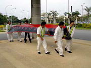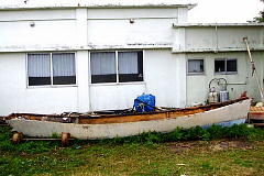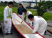 到着ロビーの景観がとても寂しい久米島空港到着ロビー内をぱあっと明るく出来る方法はないものか。しかもお金をかけないで。きょろきょろしながら道を歩いていると、ある屋敷内に捨てられた廃船(相当にボロだったので、サバニと分かったのはきれいに水洗いしてからだった)を偶然発見した。 4〜5回通い詰めて持ち主を見つけ出し、趣旨を説明して何とか安く譲ってもらえないかと打診したところ、「あっ、いいですよ。 お譲りします」と嬉しい言葉が返ってきた。 相当にオンボロである。しかしそこは芸術のセンスに長けている私ゆえ、本を見ながらサバニの外観デザインを研究し、生まれて初めて自筆で船にペイントすることになった。天気のいい日に丸2日かけて塗り上げるとアーラ不思議! きれいなサバニが出来上がった。 これを私一人だけの仕事だけで終わらせるのはもったいない。職員に呼びかけたところ、みんなが協力してくれることになった。