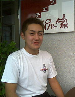 王直属・特別調査団がゆく 糸満市で大城潤也さんの情報を入手した 「ひよこ」さんから次のような依頼が来た。 <かっこいい子知ってるんですけど載せてもらえますかね? 私がよく行く喫茶店の従業員の男の人が、すごいカッコイイんですー。その人目 当てで時ゴハン食べに行くぐらいです> 店の名前は「パパの家」と言う。<南部徳洲会病院の前の道を 糸満向けに進んで3個目の信号を右に曲がるとあります>という 情報を頭に叩き込み、さっそく私は西原町から原付を 走らせた。 南部徳洲会病院の前に信号機が2つある。最初から想定外の展開である。どち らから数えるかによって、曲がる角が違ってくる。 手前の信号機から数えて3つ目を曲がったが、行けども行けども 田舎道だ。もと来た道に戻り、さらに走る。東風平大橋を過ぎて 最初の信号(右手に赤松園芸の看板が見える)を右折する。 すぐに「パパの家」を見つけた。